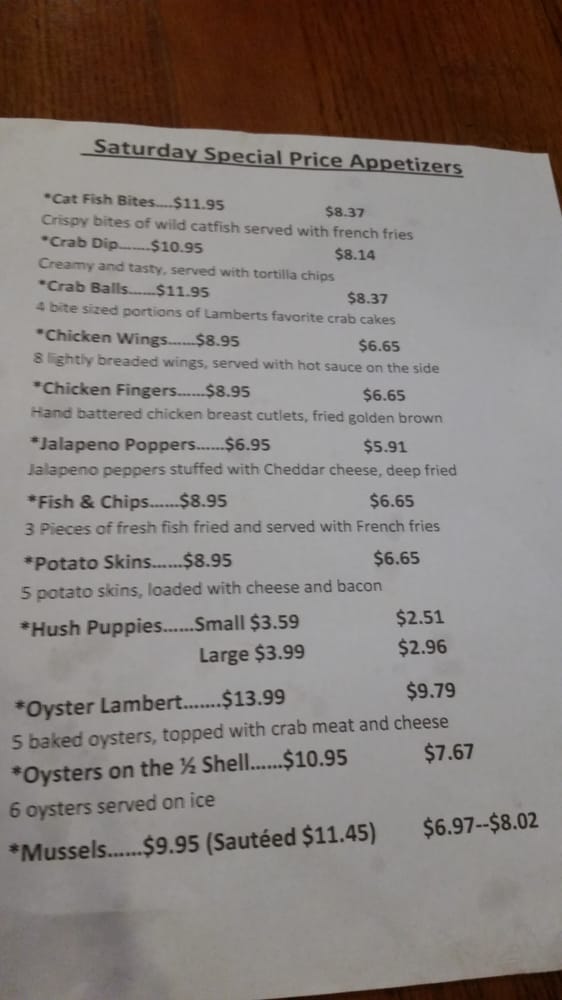 Lamberts is a hidden gem in the Lanham/Glen Dale area, offering a fun atmosphere, great food, and reasonable prices. The sports bar and seafood menu have many vegetarian options and happy hour specials. The bar area might be tight, so arrive early to enjoy stiff drinks and positive vibes. The limited menu focuses on quality, especially the crab soups, comparable to fine dining at a fraction of the cost. The wait for drinks and food can be a bit long, but the vibrant atmosphere and delicious dishes make it worth it. The friendly staff and chill vibes make Lamberts a neighborhood connection where you can come as you are. Overall, a great spot for a good time with consistently tasty food and strong drinks.